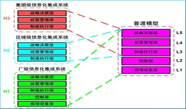 (3)H3集團公司級系統:集團公司級系統包括L3、L4、L5三層,但其結構與功能不同于H1和H2的相應三層。通過縱向集成技術實現級間、層間信息的貫通。