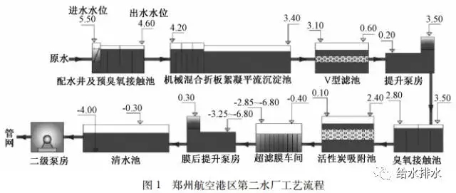 (1)混凝沉淀+砂濾+中間提升+臭氧活性炭。由圖1可知,炭吸附池出水水頭為0.10 m,清水池進(jìn)水水位為-0.30 m,炭吸附池出水可以重力流入清水池,實(shí)現(xiàn)超越超濾膜的工況。