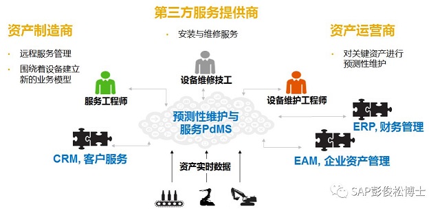 事實(shí)上,很多的業(yè)務(wù)場(chǎng)景,都涉及到流程驅(qū)動(dòng)的應(yīng)用App與數(shù)據(jù)驅(qū)動(dòng)的應(yīng)用App的協(xié)作。我們以工業(yè)互聯(lián)網(wǎng)最常用的 “預(yù)測(cè)性維護(hù)與服務(wù)PdMS”為例來說明這一過程。如下圖所示,它涉及到企業(yè)上下游和企業(yè)內(nèi)部各個(gè)部門之間的相互協(xié)同,需要各個(gè)應(yīng)用(ERP、EAM、CRM)之間的相互配合。常見的情況是,即便從現(xiàn)場(chǎng)采集了設(shè)備的運(yùn)行數(shù)據(jù),如果沒有來自EAM數(shù)據(jù)的對(duì)照,就無從了解與設(shè)備運(yùn)行數(shù)據(jù)對(duì)應(yīng)的設(shè)備狀態(tài)究竟是正常還是異常,無法給這些數(shù)據(jù)打上標(biāo)簽,從而給后續(xù)的算法和訓(xùn)練帶來很大的困難。而沒有ERP和CRM的配合,在診斷出故障之后,也不能及時(shí)進(jìn)行修理,讓PdMS的效果大打折扣。顯然,只有處理好兩類應(yīng)用App的基礎(chǔ)共享、模塊共用和數(shù)據(jù)集成,實(shí)現(xiàn)最大程度的集約化,才有可能打造出真正有經(jīng)濟(jì)價(jià)值的可持續(xù)發(fā)展的平臺(tái)——這也是稱作“平臺(tái)”的應(yīng)有之義。