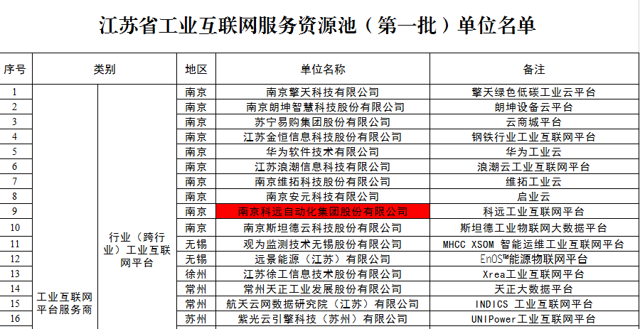根據《關于組織構建江蘇省工業互聯網服務資源池的通知》(蘇經信企信〔2018〕223號)精神,經各地審核推薦、專家評審、實地考察等環節,科遠股份作為工業互聯網平臺服務商、工業互聯網解決方案服務商、數據采集服務商,入圍江蘇省工業互聯網服務資源池(第一批)。