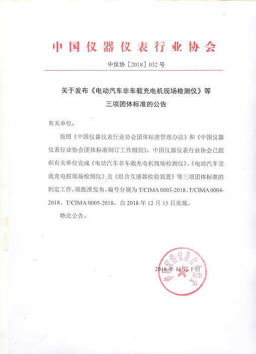 按照《中國儀器儀表行業協會團體標準管理辦法》和《中國儀器儀表行業協會團體標準制訂工作細則》,中國儀器儀表行業協會已組織有關單位完成《電動汽車非車載充電機現場檢測儀》、《電動汽車交流充電樁現場檢測儀》及《組合互感器檢驗裝置》等三項團體標準的制定工作,現批準發布,編號分別為T/CIMA 0003-2018、T/CIMA 0004-2018、T/CIMA 0005-2018,自2018年12月15日實施。