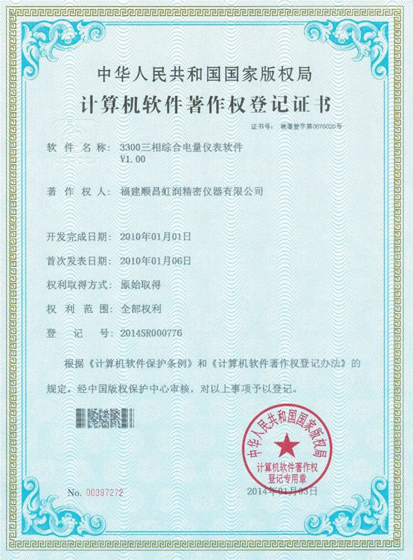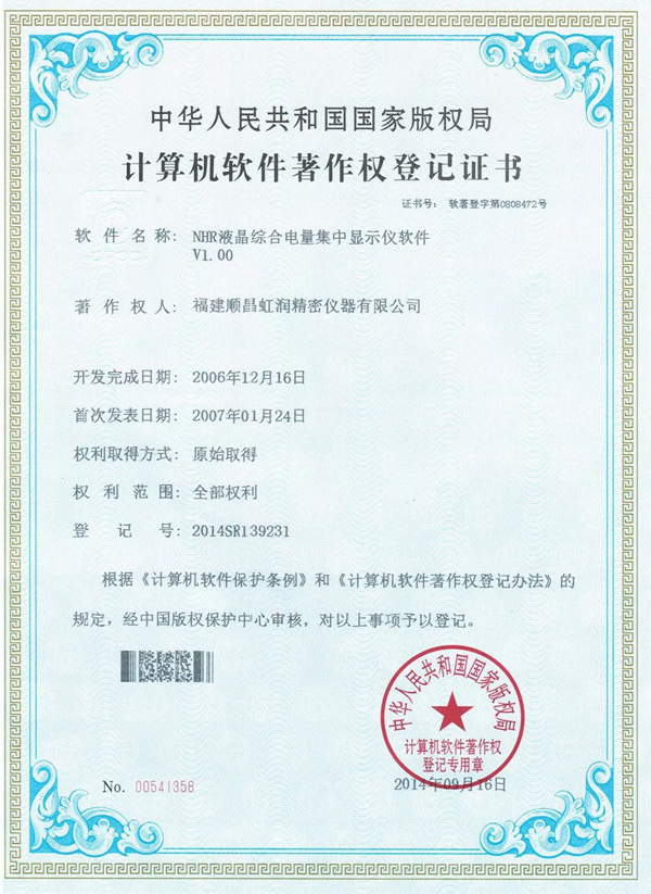 虹潤綜合電量顯示儀表是是一種用于交流電量綜合參數(shù)測量智能儀表。產(chǎn)品應(yīng)用公司自主知識產(chǎn)權(quán)開發(fā),榮獲基于DSC技術(shù)的盤裝三相綜合電量表(專利號2012101617565)國家發(fā)明專利,3300三相綜合電量儀表軟件V1.00(版權(quán)登記號2014SR000776)、NHR液晶綜合電量集中顯示儀軟件V1.00(版權(quán)登記號2014SR139231)、NHR單相電量儀表軟件V1.00(版權(quán)登記號2014SR165558)3項軟件著作權(quán)。