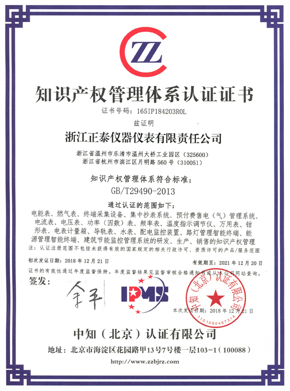 12月21日,浙江正泰儀器儀表有限責(zé)任公司(以下簡稱“正泰儀表”收到了國內(nèi)權(quán)威知識產(chǎn)權(quán)認證機構(gòu)中知(北京)認證有限公司頒發(fā)的知識產(chǎn)權(quán)管理體系認證證書,這意味著正泰儀表公司在知識產(chǎn)權(quán)領(lǐng)域獲得到重要認可,在知識產(chǎn)權(quán)方面得到進一步規(guī)范以及綜合競爭力進一步提升。