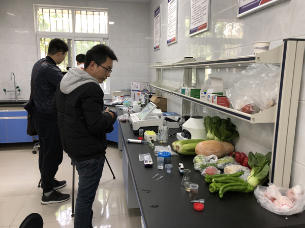 校園食品快檢室內配備有食品安全綜合分析儀、肉類水分測定儀、ATP檢測儀等各類快速檢測設備,幾名快檢員分工合作,對米面油、水果、蔬菜、肉制品等食用農產品進行農藥殘留、獸藥殘留、抗生素殘留、非法添加物等快速檢測篩查。