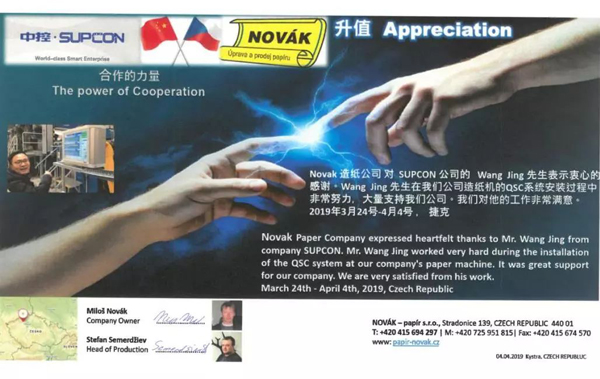 近日,中控海外團隊收到了一封來自捷克Novak Paper的感謝信。在這背后,是一段雙方友好合作、中控竭心服務的故事。