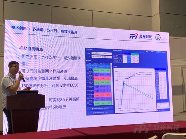 在此次2019上海水展上,聚光科技從水環境的監測技術和裝備支撐為展示目標,展會重點展出了水環境監測監管綜合解決方案、河長制解決方案、水污染源監測管理解決方案等創新成果。聚光科技聯合意大利希思迪公司針對性的展出了Micromac C水質在線分析儀、Wiz水質原位分析儀。聚光科技(杭州)股份有限公司環境資源事業部水研究部工程師周興鵬就《水質特征因子監測-綜合生物毒性及應用分析》做現場匯報。