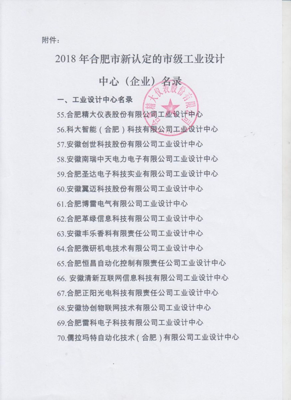根據《合肥市市級工業設計中心認定管理辦法(試行)》有關規定,經申報、評審、現場查驗、公示等程序,“合肥精大儀表股份有限公司工業設計中心”被評定為合肥市市級工業設計中心。詳見“合經信科技【2018】526號”。