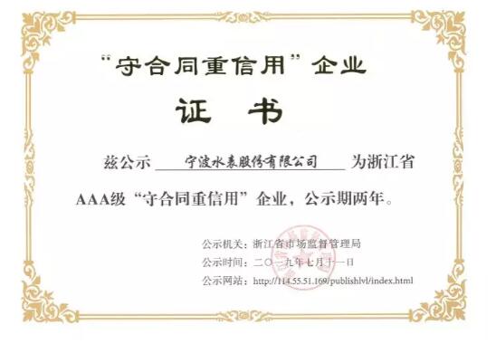 近日,憑借多年來(lái)的誠(chéng)信經(jīng)營(yíng)記錄和良好的合同履約能力,寧波水表股份有限公司順利通過(guò)浙江省市場(chǎng)監(jiān)督管理局的專(zhuān)項(xiàng)考察評(píng)選,成為2019年度“浙江省守合同重信用AAA級(jí)企業(yè)”。