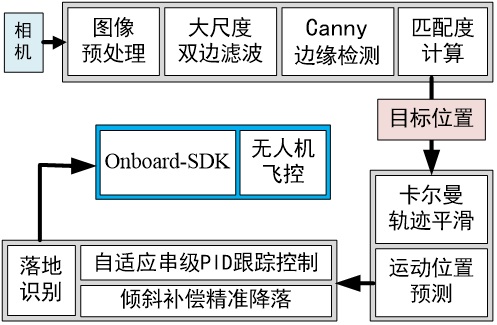 針對上述問題,科研人員設(shè)計(jì)并實(shí)現(xiàn)了基于視覺技術(shù)的車載無人機(jī)系統(tǒng)。此無人機(jī)搭載在地面的排爆機(jī)器人上,可根據(jù)需要一鍵起飛,并且能實(shí)時(shí)跟蹤地面機(jī)器人進(jìn)行協(xié)同飛行,為地面機(jī)器人提供第三視角。也可以遙控進(jìn)行遠(yuǎn)程偵查,主動(dòng)目標(biāo)搜索,對現(xiàn)場環(huán)境進(jìn)行預(yù)先判斷,抓取作業(yè)時(shí)可為操作手提供第三視角進(jìn)行輔助等。執(zhí)行完任務(wù)后無人機(jī)可一鍵自主返航,并且精確降落在地面機(jī)器人平臺(tái)上,然后隨機(jī)器人一同返回。該研究得到了國家重點(diǎn)研發(fā)計(jì)劃的支持。