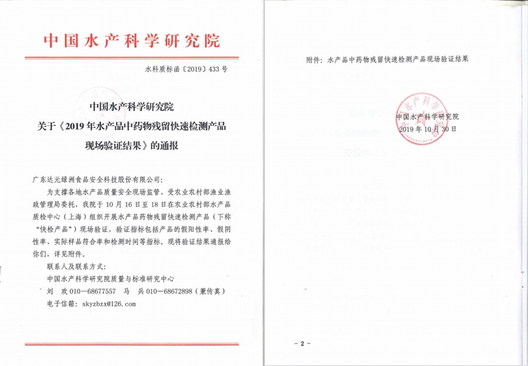 2019年10月16-18日,廣東達元綠洲食品安全科技股份有限公司參加了由農(nóng)業(yè)農(nóng)村部漁業(yè)漁政管理局主辦,中國水產(chǎn)科學研究院承辦的“2019年水產(chǎn)品中藥物殘留快檢產(chǎn)品的驗證”工作,食安科技生產(chǎn)的孔雀石綠快速檢測盒(FST-膠體金)、氯霉素快速檢測盒(膠體金)、呋喃類代謝物快速檢測盒(膠體金)、呋喃類代謝物快速檢測盒(FST-熒光層析)等10項產(chǎn)品全部通過驗證!
