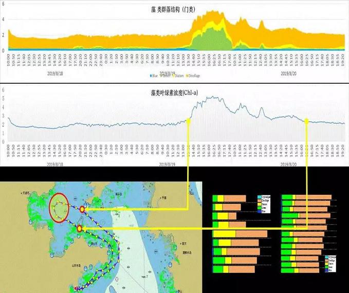 圖8為2019年中科院自行研制的海洋生物要素在線監測儀在青島南姜碼頭試驗,成功獲取了藻類群落結構、葉綠素濃度等數據以及典型海域生物要素分布特征。