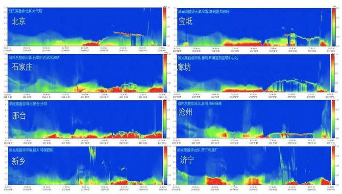 在2017年9月實施的“大氣重污染成因與治理攻關項目(總理基金)”中,中國科學院安徽光學精密機械研究所聯合國內其他院所高校在京津冀地區建立了16個地基立體觀測站點,開展了基于激光雷達等儀器的顆粒物立體探測研究。圖6為2017年12月25-30日激光雷達觀測的一次污染過程。12月27日下午京津冀地區污染物主要分布在1km以下,28日高空1km污染團與近地面污染混合,污染過程持續,28日夜間-29日凌晨,混合層高度降低,局地污染加劇至30日,30日下午混合層抬升,風速增大,擴散條件轉好,污染消散。地基單點固定式激光雷達的長期觀測十分必要,對于研究和統計分析一些重要大氣成分的變化規律具有重要價值。但車載、船載和機載式的可移動式平臺,機動性強,更適合應急和特殊環境的觀測,如機載式和船載式可以在海洋上空觀測,其觀測資料更能代表區域性大氣成分的分布??傊?,多平臺、多類型雷達的聯合運用,在一些區域性乃至全球性大氣輻射和環境研究的對比實驗中發揮了重要作用。