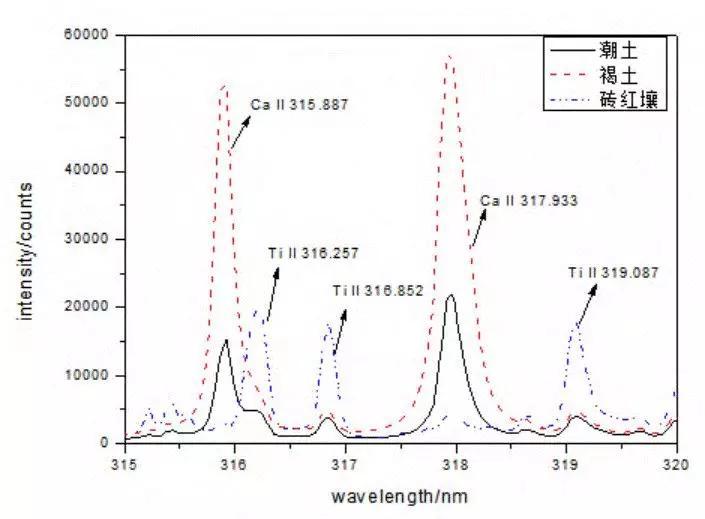 不同類型的土壤其組成的元素在含量上具有較大的差異,即使是同一類型的土壤,其組成元素也會存在微小的差異。圖10是褐土、潮土和磚紅壤三類土壤在315-320nm光譜范圍內的特征譜線,其中褐土的Ca特征譜線最強,而磚紅壤的Ti特征譜線強度最大。從這些土壤的LIBS光譜中可明顯體現出其元素含量的差異。
