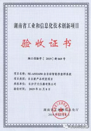 2019年12月6日,開元儀器自主研發(fā)的四款新產(chǎn)品獲得湖南省工信廳頒發(fā)的驗(yàn)收證書。11月8日湖南省工信廳和長沙市工信局在長沙開元儀器有限公司主持召開了新產(chǎn)品驗(yàn)收會(huì)。會(huì)議邀請了電力、煤炭、質(zhì)檢等行業(yè)領(lǐng)域及高校和科研院所的30多位專家,對由開元儀器自主研發(fā)的機(jī)器人智能化驗(yàn)系統(tǒng)、智能全自動(dòng)制樣系統(tǒng)、全自動(dòng)智能存查樣系統(tǒng)和全自動(dòng)智能分樣封裝系統(tǒng)四款新產(chǎn)品進(jìn)行了技術(shù)創(chuàng)新評(píng)估和驗(yàn)收。