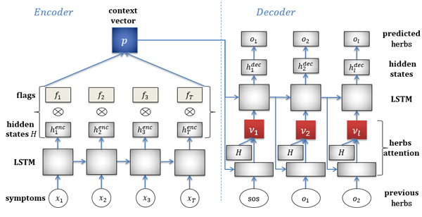 在題為AttentiveHerb: A Novel Method for Traditional Medicine Prescription Generation的研究論文中,沈陽(yáng)自動(dòng)化所大數(shù)據(jù)智能技術(shù)組提出了一種基于深度學(xué)習(xí)技術(shù)的智能中醫(yī)藥方生成方法。該方法基于中醫(yī)診療過程的核心思想——“辨證論治”,利用深度循環(huán)神經(jīng)網(wǎng)絡(luò)對(duì)患者的癥狀信息進(jìn)行特征提取,并在考慮患者不同病癥嚴(yán)重性程度的基礎(chǔ)上,針對(duì)不同癥狀動(dòng)態(tài)生成藥方中的每一味對(duì)癥中藥,實(shí)現(xiàn)智能中醫(yī)自動(dòng)化診療,并成功模擬中醫(yī)個(gè)性化診療這一特點(diǎn)。此外,相較于之前的智能中醫(yī)研究,該方法完全基于學(xué)習(xí)方法,無需事先人為設(shè)計(jì)任何規(guī)則,表現(xiàn)出良好的自適應(yīng)性。該工作不僅是智能中醫(yī)研究中的新探索和突破,也為未來應(yīng)用人工智能技術(shù)在門診診療的研究提供了研究思路。