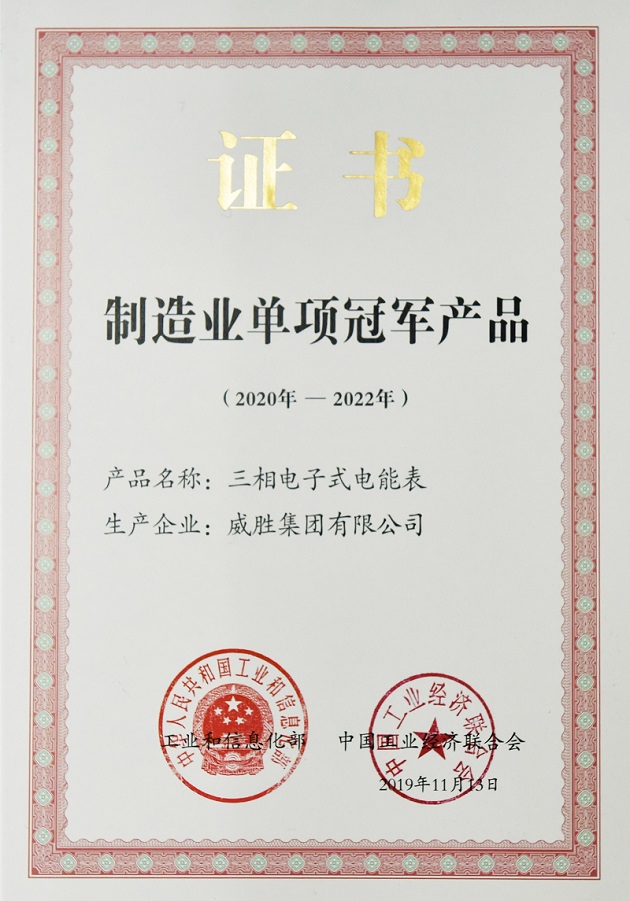 10月25日,國家工業(yè)和信息化部發(fā)布《擬公布的第四批及擬通過復核的第一批制造業(yè)單項冠軍名單公示》,威勝集團三相電子式電能表成功入選第四批制造業(yè)單項冠軍產品。