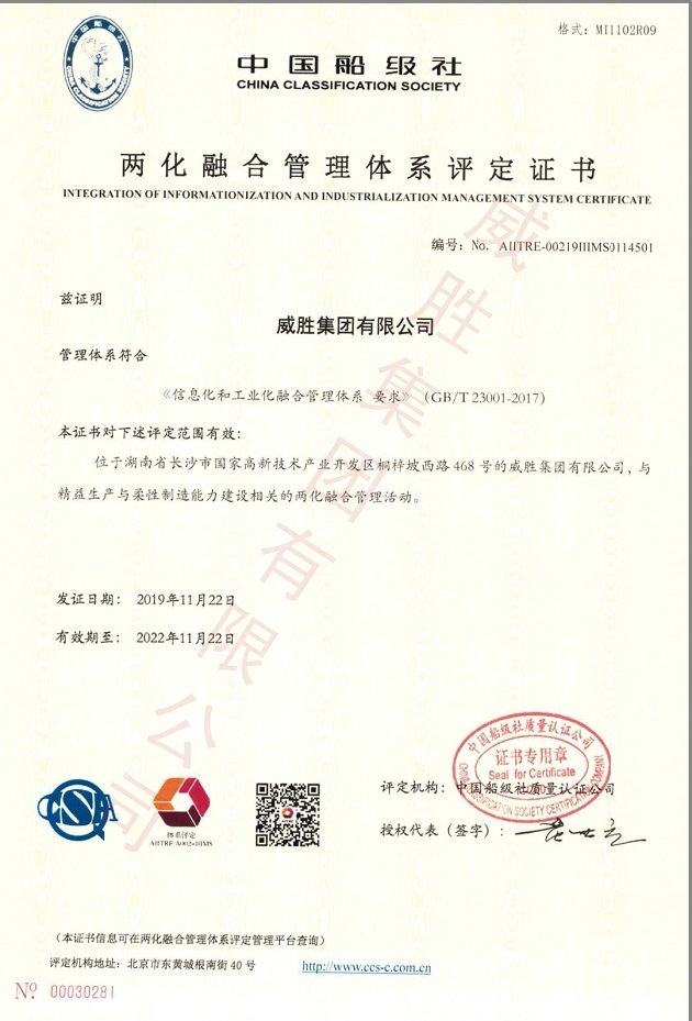 兩化融合管理體系評定證書