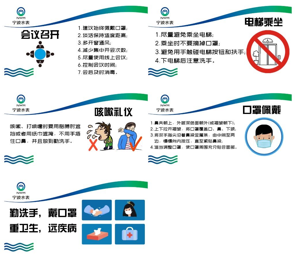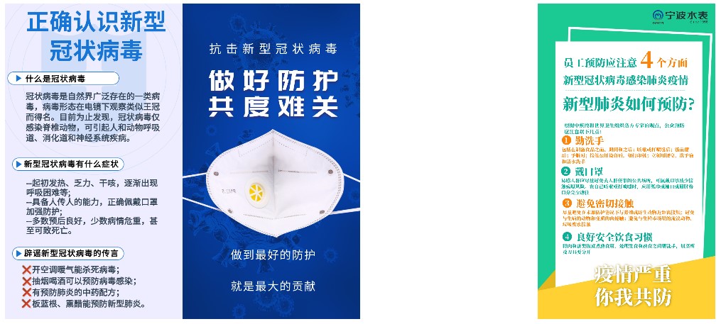 2020年2月8日,寧波水表在公司“創(chuàng)意魚群”等微信公眾號上發(fā)布《寧波水表—安全生產(chǎn)思維阻擊疫情》等宣傳資料,并號召全員積極轉發(fā)朋友圈、各類微信群,通過對疫情期間防護工具、防疫要素等相關知識的教育宣傳,進一步提高全司員工及公眾對疫情的自我防護意識。