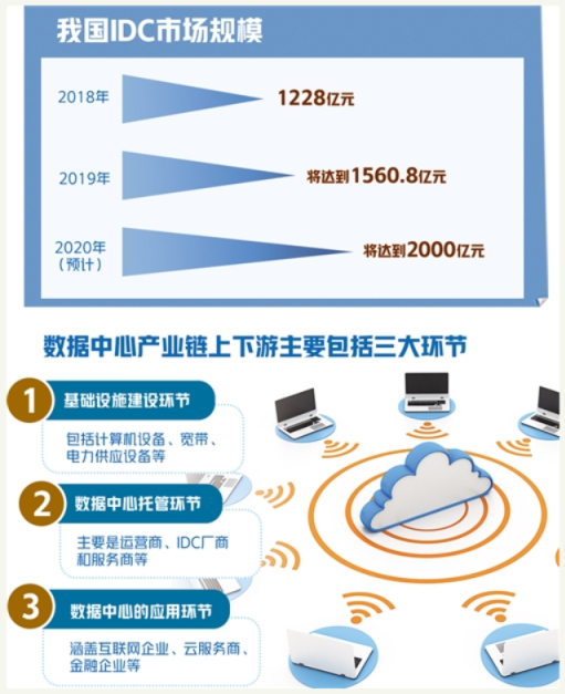 根據(jù)前瞻產(chǎn)業(yè)研究院的數(shù)據(jù),2018年我國IDC市場(chǎng)規(guī)模為1228億元,2019年將達(dá)到1560.8億元,同比增長27.1%,按照該統(tǒng)計(jì)口徑,且考慮到政策支持力度的加大,預(yù)計(jì)2020年數(shù)據(jù)中心的市場(chǎng)規(guī)模將達(dá)到2000億元。