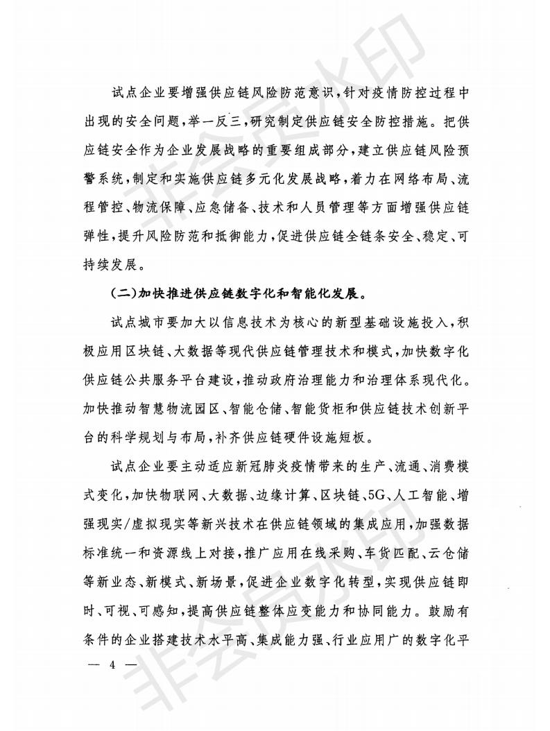 通知指出,為認真貫徹落實打贏脫貧攻堅戰、全面建成小康社會重大戰略部署和堅持在常態化疫情防控中加快推進生產生活秩序全面恢復相關要求,針對供應鏈安全性和協同性方面存在的短板弱項,積極應對市場新需求、新業態、新模式加快發展給供應鏈創新與應用工作提出的新要求,要在原有試點任務基礎上,重點做好加強供應鏈安全建設、加快推進供應鏈數字化和智能化發展、促進穩定全球供應鏈、助力決戰決勝脫貧攻堅和充分利用供應鏈金融服務實體企業等五個方面工作。