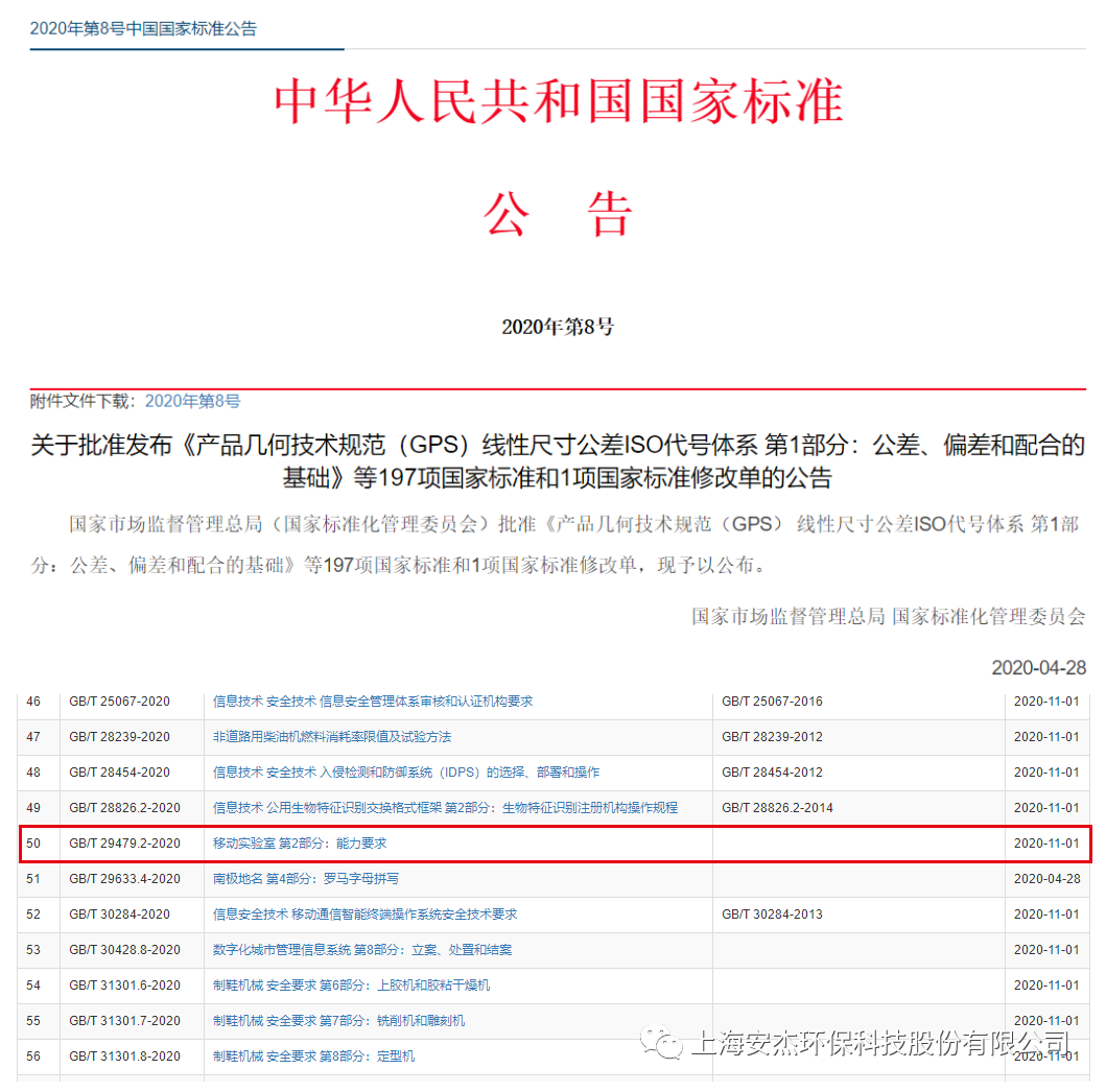 2020年04月28日,國家市場監督管理總局國家標準化管理委員會發布了2020年第8號中國國家標準公告,《GB/T29479.2-2020 移動實驗室 第二部分:能力要求》獲得批準發布。
