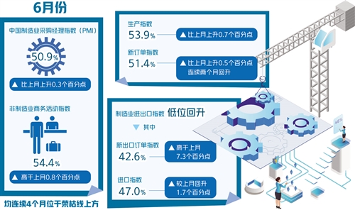 6月30日,國家統(tǒng)計局服務業(yè)調查中心和中國物流與采購聯(lián)合會發(fā)布了中國制造業(yè)采購經理指數(shù)(PMI)。6月份,制造業(yè)PMI為50.9%,比上月上升0.3個百分點,連續(xù)4個月位于榮枯線上方;非制造業(yè)PMI為54.4%,比上個月擴大0.8個百分點。