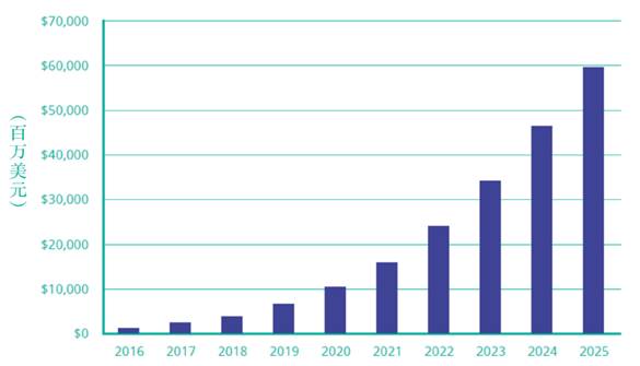 圖1 全球市場(chǎng)中人工智能的收入:2016年~2025年(預(yù)測(cè))(來源:Tractica)
