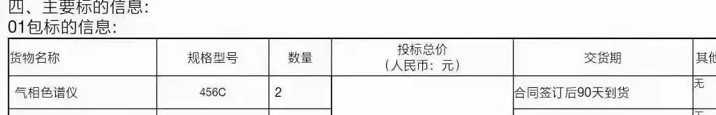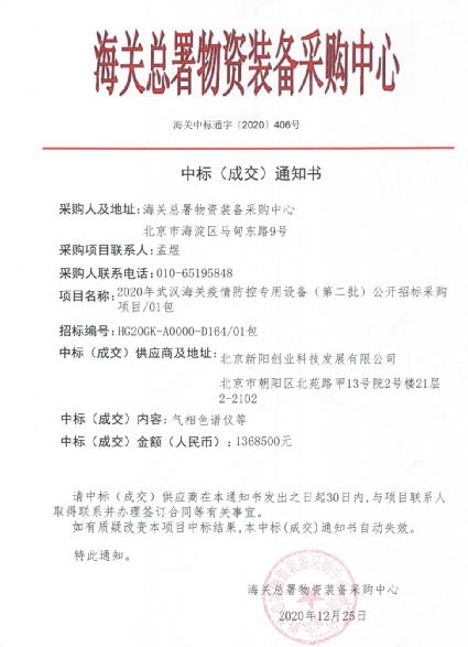 近日,海關(guān)總署物資裝備采購中心發(fā)布項(xiàng)目中標(biāo)結(jié)果,此次招標(biāo)為2020年武漢海關(guān)疫情防控專用設(shè)備(第二批)公開招標(biāo)采購項(xiàng)目,招標(biāo)文件編號(hào)HG20GK-A0000-D164,招標(biāo)采購共3包,涉及氣相色譜儀、便攜式核酸檢測箱、熒光定量PCR儀等相關(guān)設(shè)備,天美公司2臺(tái)賽里安456C氣相色譜儀成功入選。