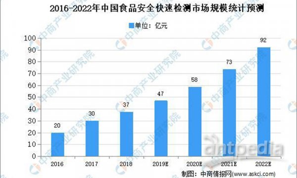 中國食品安全快檢產(chǎn)業(yè)化僅僅二十年,在我國分析測試領(lǐng)域,雖是“小荷才露尖尖角”,但發(fā)展速度非常迅猛。據(jù)中商產(chǎn)業(yè)研究院報告顯示,我國食品快速檢測的投入規(guī)模約占食品檢測總投入規(guī)模的30%,數(shù)據(jù)顯示,2016年、2017年國內(nèi)食品快速檢測市場規(guī)模分別為19.68億元、29.77億元,預(yù)計2017年至2022年的年度復(fù)合增長率為25.24%,到2022年國內(nèi)食品安全快速檢測市場規(guī)模(包括試劑和快檢儀器)為91.75億元。快檢行業(yè)的迅猛發(fā)展來源于幾大方面:首先,新《食品安全法》肯定了快檢在市場監(jiān)管中的地位。其次,食品安全的分段管理、現(xiàn)場檢測極大拓展了市場對快檢的需求。第三,隨著國家監(jiān)管力度的加大,更多的污染物成為監(jiān)管目標(biāo),更多食物的安全引起社會的關(guān)注。第四,科技部自“十二五”起,對快檢技術(shù)給予了持續(xù)的支撐。因此快檢技術(shù)和產(chǎn)業(yè)在中國是蓬勃的新生力量。