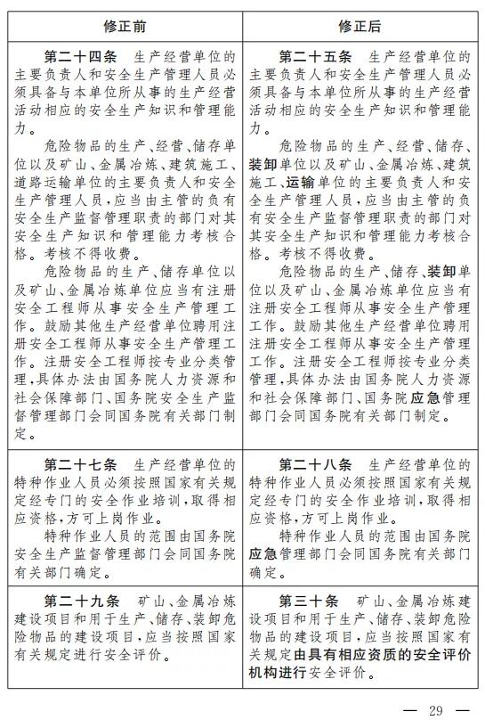 九、將第二十九條改為第三十條,修改為:“礦山、金屬冶煉建設(shè)項目和用于生產(chǎn)、儲存、裝卸危險物品的建設(shè)項目,應(yīng)當(dāng)按照國家有關(guān)規(guī)定由具有相應(yīng)資質(zhì)的安全評價機(jī)構(gòu)進(jìn)行安全評價。”