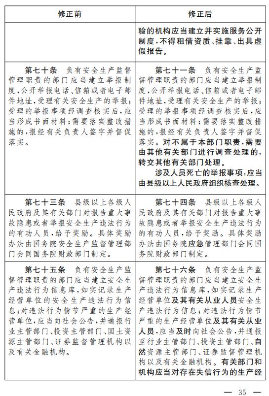十七、將第七十條改為第七十一條,修改為:“負(fù)有安全生產(chǎn)監(jiān)督管理職責(zé)的部門應(yīng)當(dāng)建立舉報制度,公開舉報電話、信箱或者電子郵件地址,受理有關(guān)安全生產(chǎn)的舉報;受理的舉報事項經(jīng)調(diào)查核實后,應(yīng)當(dāng)形成書面材料;需要落實整改措施的,報經(jīng)有關(guān)負(fù)責(zé)人簽字并督促落實。對不屬于本部門職責(zé),需要由其他有關(guān)部門進(jìn)行調(diào)查處理的,轉(zhuǎn)交其他有關(guān)部門處理。