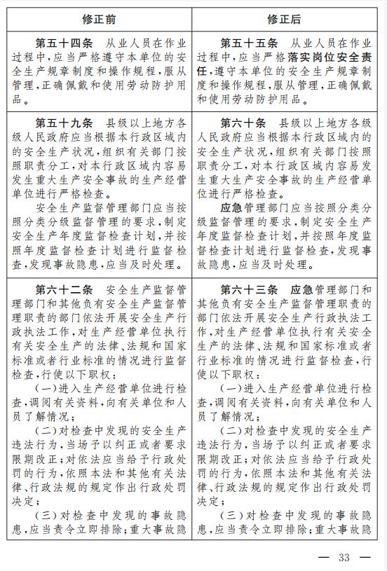 十五、將第五十四條改為第五十五條,修改為:“從業(yè)人員在作業(yè)過程中,應(yīng)當(dāng)嚴(yán)格落實崗位安全責(zé)任,遵守本單位的安全生產(chǎn)規(guī)章制度和操作規(guī)程,服從管理,正確佩戴和使用勞動防護(hù)用品。”