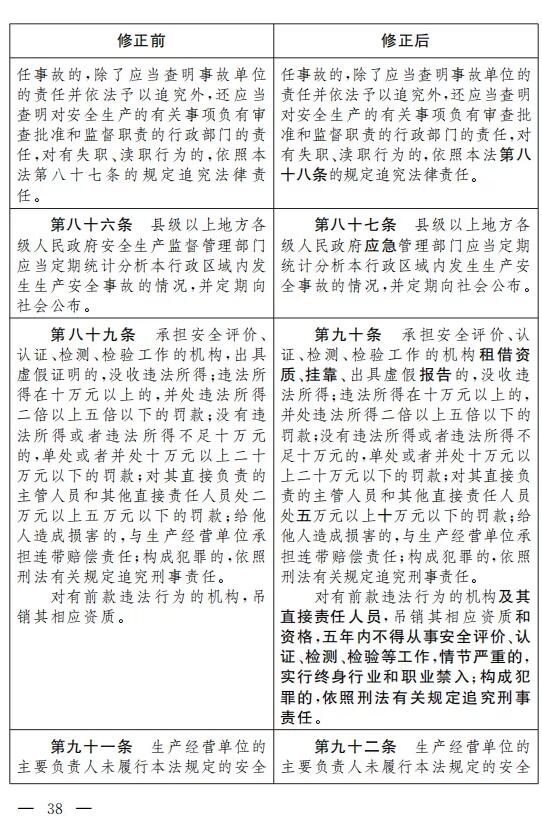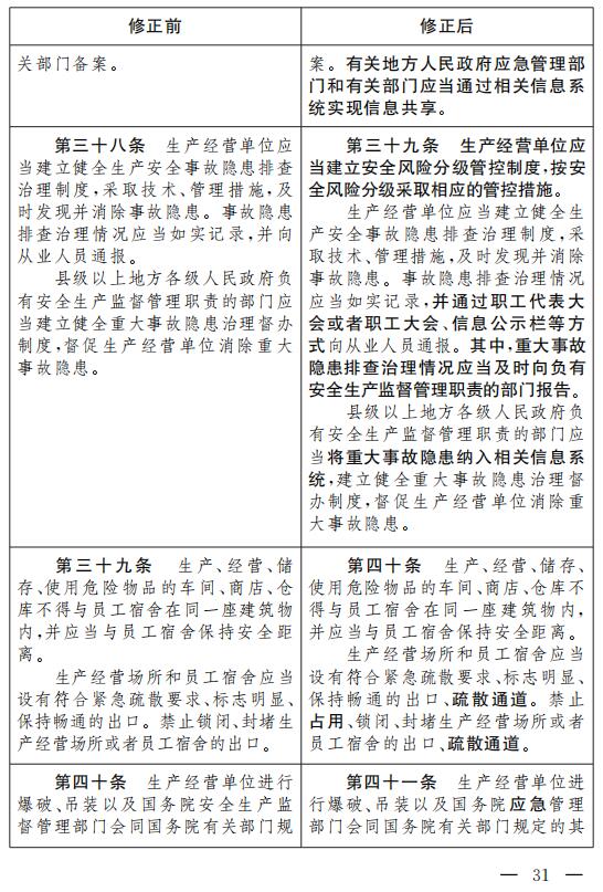 十一、將第三十八條改為第三十九條,修改為:“生產(chǎn)經(jīng)營單位應(yīng)當(dāng)建立安全風(fēng)險分級管控制度,按安全風(fēng)險分級采取相應(yīng)的管控措施。