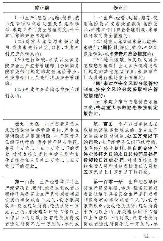 二十九、將第九十九條改為第一百條,修改為:“生產(chǎn)經(jīng)營單位未采取措施消除事故隱患的,責(zé)令立即消除或者限期消除, 處五萬元以下的罰款;生產(chǎn)經(jīng)營單位拒不執(zhí)行的,責(zé)令停產(chǎn)停業(yè)整頓,并自責(zé)令停產(chǎn)停業(yè)整頓之日的次日起按照原處罰數(shù)額按日連續(xù)處罰,對其直接負(fù)責(zé)的主管人員和其他直接責(zé)任人員處五萬元以上十萬元以下的罰款。”