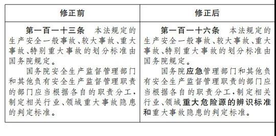 三十六、將第一百一十三條改為第一百一十六條,第二款修改為:“國務(wù)院應(yīng)急管理部門和其他負(fù)有安全生產(chǎn)監(jiān)督管理職責(zé)的部門應(yīng)當(dāng)根據(jù)各自的職責(zé)分工,制定相關(guān)行業(yè)、領(lǐng)域重大危險源的辨識標(biāo)準(zhǔn)和重大事故隱患的判定標(biāo)準(zhǔn)。”