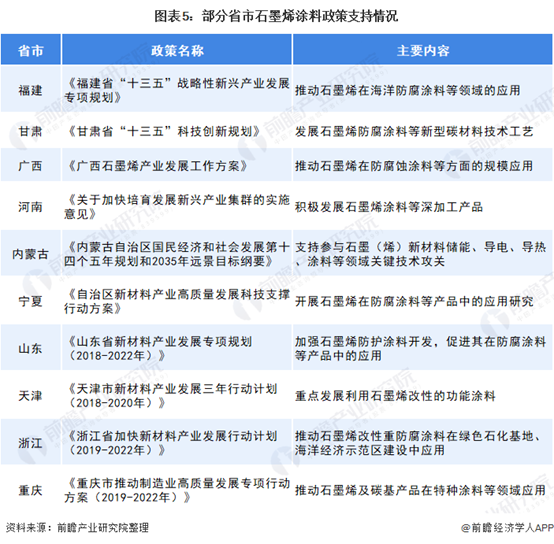 國內(nèi)多個省市也積極推動石墨烯涂料的相關發(fā)展,包括福建、甘肅、廣西、河南、山東等地均發(fā)布政策支持石墨烯涂料的發(fā)展,推動石墨烯涂料技術研發(fā)和應用。并且主要聚焦在防腐領域,大力發(fā)展石墨烯防腐涂料。
