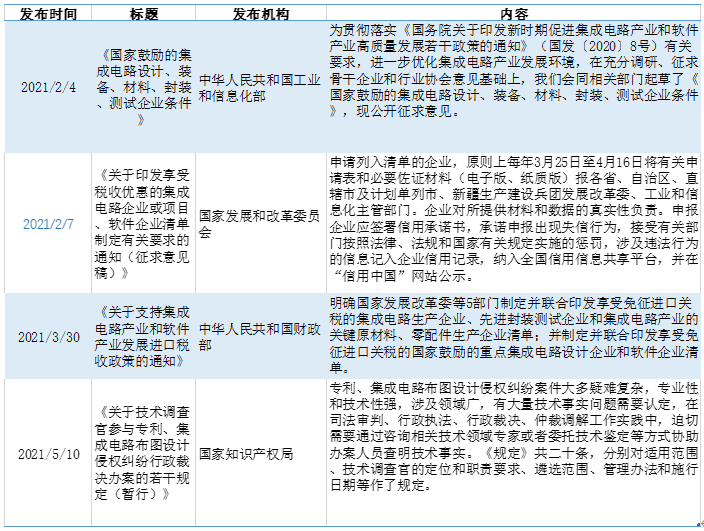 2021年1-8月國(guó)家針對(duì)集成電路產(chǎn)業(yè)出臺(tái)的政策主要集中在稅收、知識(shí)產(chǎn)權(quán)保護(hù)及推動(dòng)產(chǎn)業(yè)發(fā)展等方面,其中稅收優(yōu)惠政策是該階段的主題,2021年2月國(guó)家發(fā)展和改革委員會(huì)發(fā)布了《關(guān)于印發(fā)享受稅收優(yōu)惠的集成電路企業(yè)或項(xiàng)目、軟件企業(yè)清單制定有關(guān)要求的通知(征求意見(jiàn)稿)》,隨后在3月份財(cái)政部等5部門(mén)聯(lián)合發(fā)布《關(guān)于支持集成電路產(chǎn)業(yè)和軟件產(chǎn)業(yè)發(fā)展進(jìn)口稅收政策的通知》,這些政策規(guī)定了集成電路行業(yè)享受稅收優(yōu)惠條件和需履行的義務(wù)。除此之外,國(guó)家知識(shí)產(chǎn)權(quán)局發(fā)布了《關(guān)于技術(shù)調(diào)查官參與專(zhuān)利、集成電路布圖設(shè)計(jì)侵權(quán)糾紛行政裁決辦案的若干規(guī)定(暫行)》以期能夠解決專(zhuān)利、集成電路布圖設(shè)計(jì)侵權(quán)糾紛問(wèn)題。從發(fā)布的政策看,目前有關(guān)部門(mén)對(duì)于支持集成電路產(chǎn)業(yè)的發(fā)展多管齊下,從稅收優(yōu)惠、知識(shí)產(chǎn)權(quán)保護(hù)等方面優(yōu)化產(chǎn)業(yè)發(fā)展環(huán)境,推動(dòng)產(chǎn)業(yè)發(fā)展。