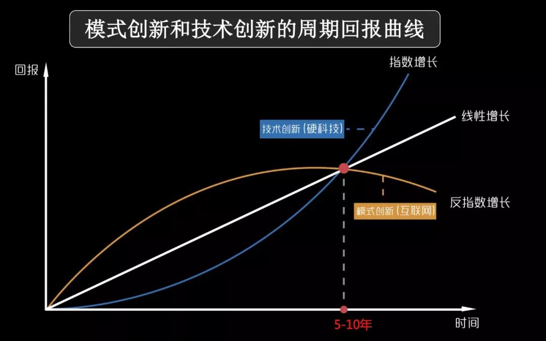 我們再來談談模式創新和技術創新,大多數人對回報曲線理解不是很透徹,我們很多人受農業時代的影響,認為“一分耕耘一分回報”,符合線性增長,而且春種秋收也非常明確,當年就有回報。
