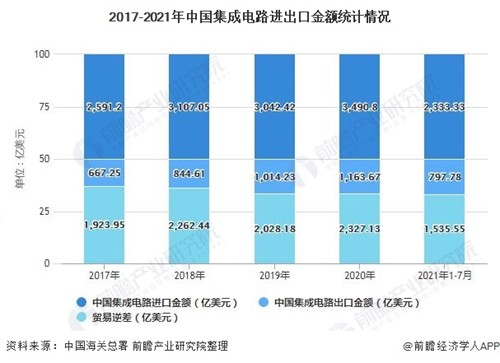 截止至2021年7月,我國集成電路行業進口金額達到2333.33億美元,出口金額達到797.78億美元,貿易逆差實現1535.55億美元。
