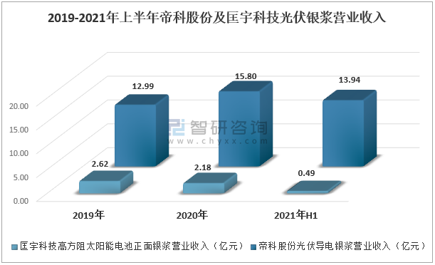 2020年帝科股份光伏導(dǎo)電銀漿營(yíng)業(yè)收入為15.80億元,匡宇科技高方阻太陽(yáng)能電池正面銀漿營(yíng)業(yè)收入為2.18億元。2021年上半年帝科股份光伏導(dǎo)電銀漿營(yíng)業(yè)收入為13.94億元,匡宇科技高方阻太陽(yáng)能電池正面銀漿營(yíng)業(yè)收入為0.49億元。