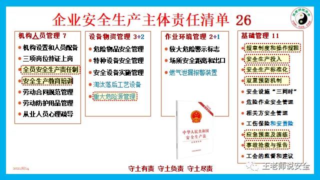 3、在以上清單中,用淺黃色圈出來的9條主體責任,是企業的主要負責人和安全生產管理人員的相關職責;鑒于其要求本身和盡職履責的重要性,特別做了提示。