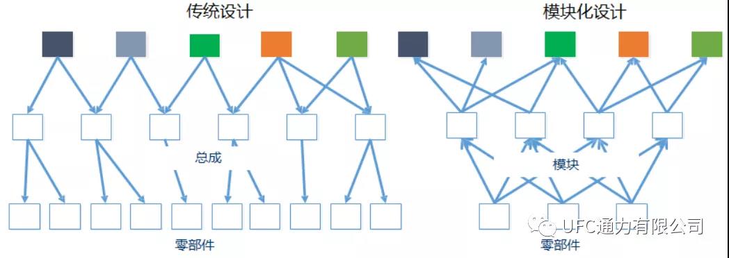 模塊化設(shè)計(jì)是將產(chǎn)品中的某些要素(如零部件、標(biāo)準(zhǔn)件、軟件控制程序等)組合在一起,構(gòu)成一個(gè)具有特定功能的子系統(tǒng),并將這個(gè)子系統(tǒng)作為通用性的模塊與其他產(chǎn)品要素進(jìn)行多種組合,構(gòu)成新的系統(tǒng),產(chǎn)生多種不同功能或相同功能但不同性能的系列產(chǎn)品。與傳統(tǒng)設(shè)計(jì)相比,如圖1所示,模塊化設(shè)計(jì)能夠幫助企業(yè)使用盡可能少的零部件,更少的制造設(shè)備、工模具,更低的采購(gòu)成本,生產(chǎn)出更多的產(chǎn)品種類(lèi),滿足市場(chǎng)的多樣化需求。