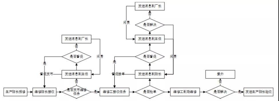 維修工接單后,到達指定位置對設備維修,維修結束后發送維修完成的消息給生產班長進行驗收,驗收通過后由生產班長結束流程。在報修流程中有幾個關鍵點是保證維修任務及時完成的關鍵點: