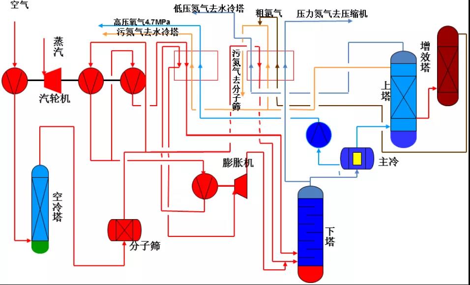 多次的重復(fù)上述過(guò)程,氣相的氮濃度就不斷增加,液相的氧濃度也能不斷的增加。這樣經(jīng)過(guò)多次的蒸發(fā)與冷凝就能完成整個(gè)精餾過(guò)程,從而將空氣中的氧和氮分離開(kāi)來(lái)。空氣在下塔被初步精餾為氣氮、污液氮和富氧液空,以節(jié)流閥減壓降溫后送至上塔作為上塔的回流液,進(jìn)一步實(shí)現(xiàn)精餾,最終在上塔頂部得到純氮?dú)?,下部得到合格的液氧產(chǎn)品。