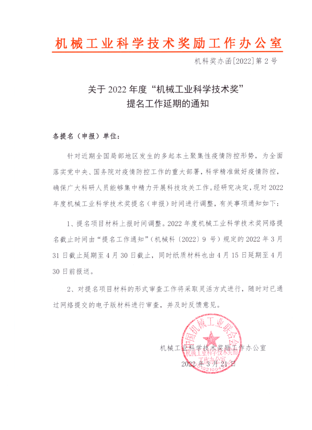針對近期全國局部地區(qū)發(fā)生的多起本土聚集性疫情防控形勢, 為全面落實黨中央、國務(wù)院對疫情防控工作的重大部署,科學(xué)精準做好疫情防控,確保廣大科研人員能夠集中精力開展科技攻關(guān)工作。經(jīng)研究決定,現(xiàn)對2022年度機械工業(yè)科學(xué)技術(shù)獎提名(申報)時間進行調(diào)整,有關(guān)事項通知如下∶