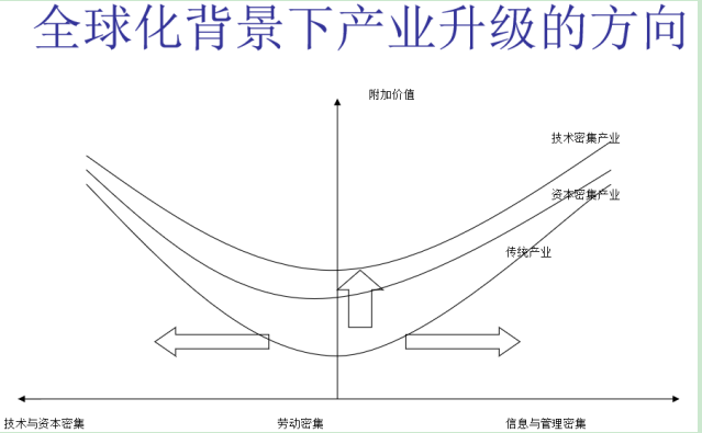 這條三條線代表不同的產(chǎn)業(yè),最低的是傳統(tǒng)產(chǎn)業(yè),往上是資本密集產(chǎn)業(yè)、技術(shù)密集產(chǎn)業(yè)。在同等價格環(huán)節(jié)上,它們都會有一個升級的過程??v向是傳統(tǒng)產(chǎn)業(yè)升級,叫產(chǎn)業(yè)間的升級。因為有了全球價值鏈,一個國家的升級有了兩個新的方向,在微笑曲線向兩端升級,就是從低附加價值環(huán)節(jié)向上游研發(fā)和復(fù)雜零部件生產(chǎn)升級,以及向下游去做服務(wù)、做品牌。在新的全球化背景下,一個國家的升級有了三個方向,既有傳統(tǒng)的產(chǎn)業(yè)間升級,同時又有了價值鏈的升級。這是我們討論全球價值鏈帶來的一個很重要的新思路。