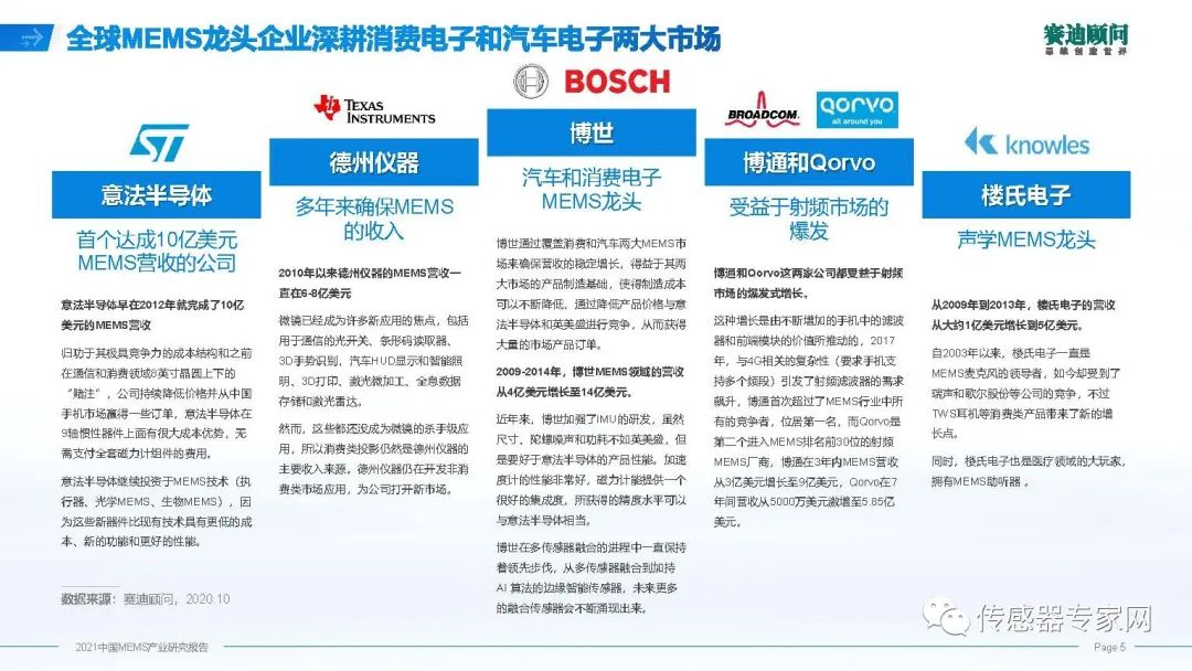MEMS產(chǎn)業(yè)從上個(gè)世紀(jì)八十年代初開始規(guī)模應(yīng)用,經(jīng)過將近四十年的發(fā)展,已經(jīng)形成了一批國(guó)際上領(lǐng)先企業(yè),有ST、博通、博世,有一個(gè)特點(diǎn),日韓和臺(tái)灣企業(yè)比較少,主要是歐美企業(yè),縱觀經(jīng)濟(jì)變遷,包括新型顯示、集成電路都有這個(gè)特點(diǎn),現(xiàn)在MEMS產(chǎn)業(yè)領(lǐng)導(dǎo)廠商,仍然是美國(guó)和歐洲企業(yè)。