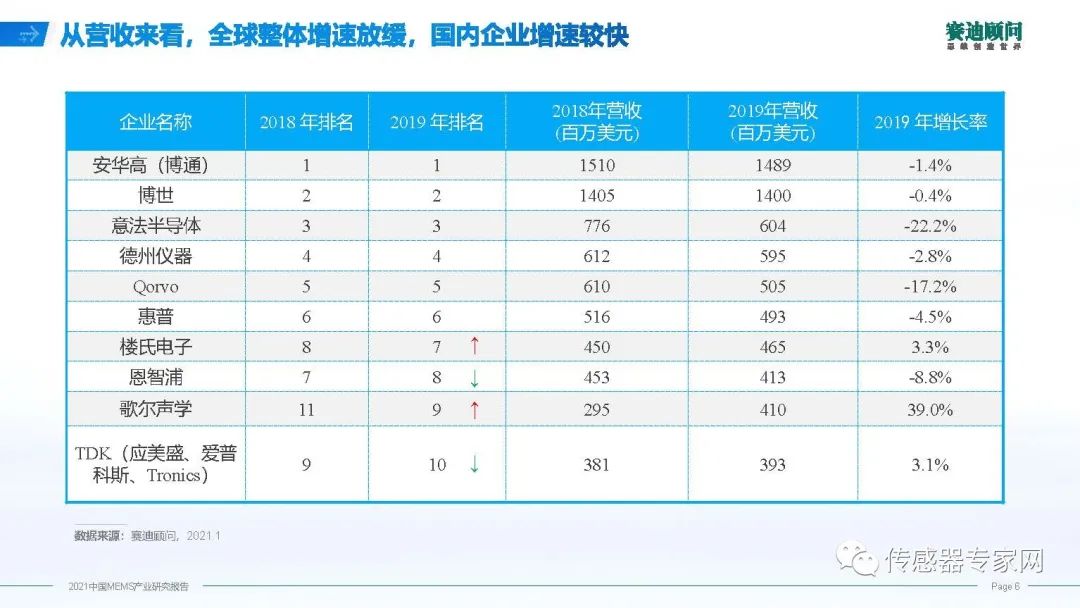 在全球MEMS廠商格局中,我們作為后來者,其實(shí)差距并不大,歌爾聲學(xué)現(xiàn)在是全球第九大廠商。在2019年全球不景氣的情況下,國(guó)內(nèi)企業(yè)依然保持高速的增長(zhǎng),再次引證國(guó)內(nèi)企業(yè)作為后發(fā)優(yōu)勢(shì),趕超正多其時(shí)。