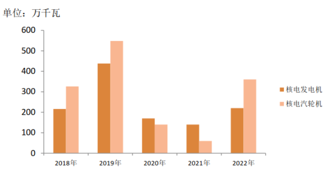 2022年,國內企業生產完成核電發電機2臺、核電汽輪機3臺、反應堆壓力容器4臺、蒸汽發生器17臺、穩壓器1臺、堆內構件3套、控制棒驅動機構1套、主泵14臺、主管道2套、環形吊車5臺、電氣貫穿件3套、數字化儀控DCS 2套、低壓加熱器3臺、汽水分離再熱器2臺、凝汽器4臺等主設備。主要供應機組有“國和一號”石島灣示范工程,“華龍一號”漳州一期、太平嶺一期、防城港二期、昌江二期、三澳一期等。