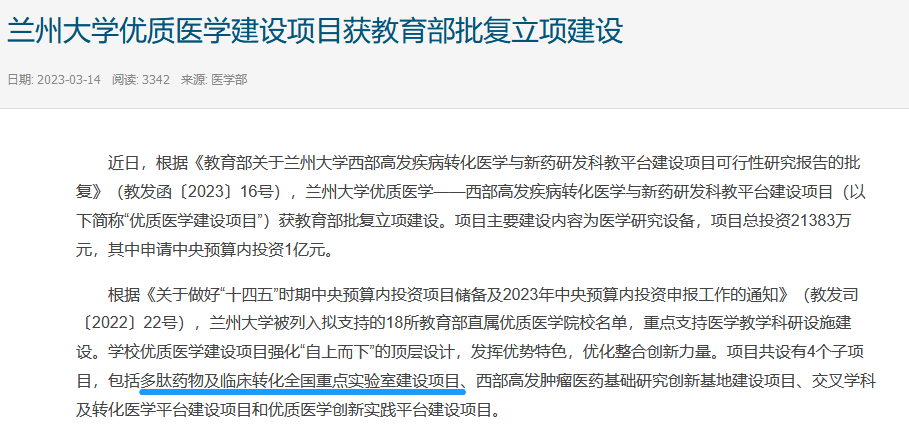 近日,蘭州大學(xué)優(yōu)質(zhì)醫(yī)學(xué)建設(shè)項目獲教育部批復(fù)立項建設(shè),項目共設(shè)有4個子項目,包括多肽藥物及臨床轉(zhuǎn)化全國重點實驗室建設(shè)項目、西部高發(fā)腫瘤醫(yī)藥基礎(chǔ)研究創(chuàng)新基地建設(shè)項目、交叉學(xué)科及轉(zhuǎn)化醫(yī)學(xué)平臺建設(shè)項目和優(yōu)質(zhì)醫(yī)學(xué)創(chuàng)新實踐平臺建設(shè)項目。